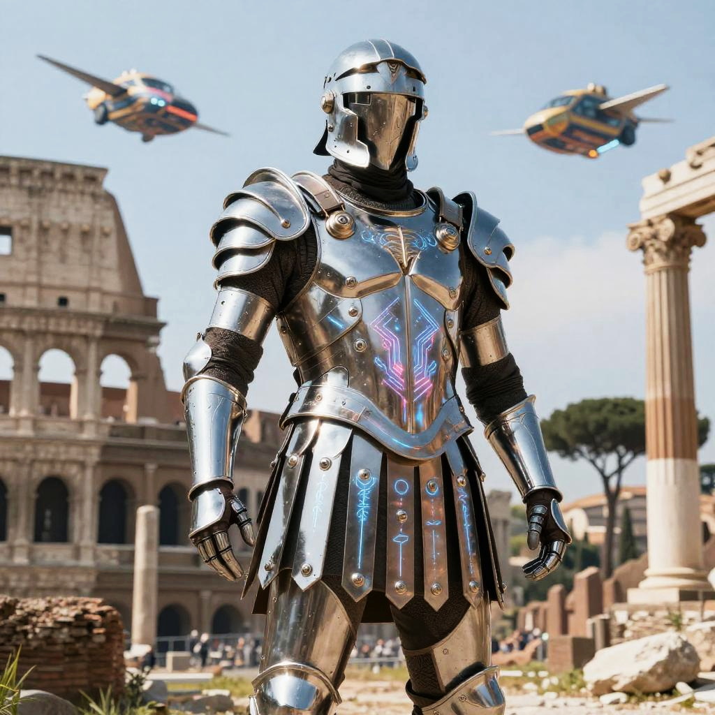 A warrior wearing futuristic Roman armor, featuring sleek chrome plates, holographic elements, and illuminated patterns, standing amidst ruins of a futuristic Rome with flying vehicles overhead, combining classical motifs and high-tech enhancements.