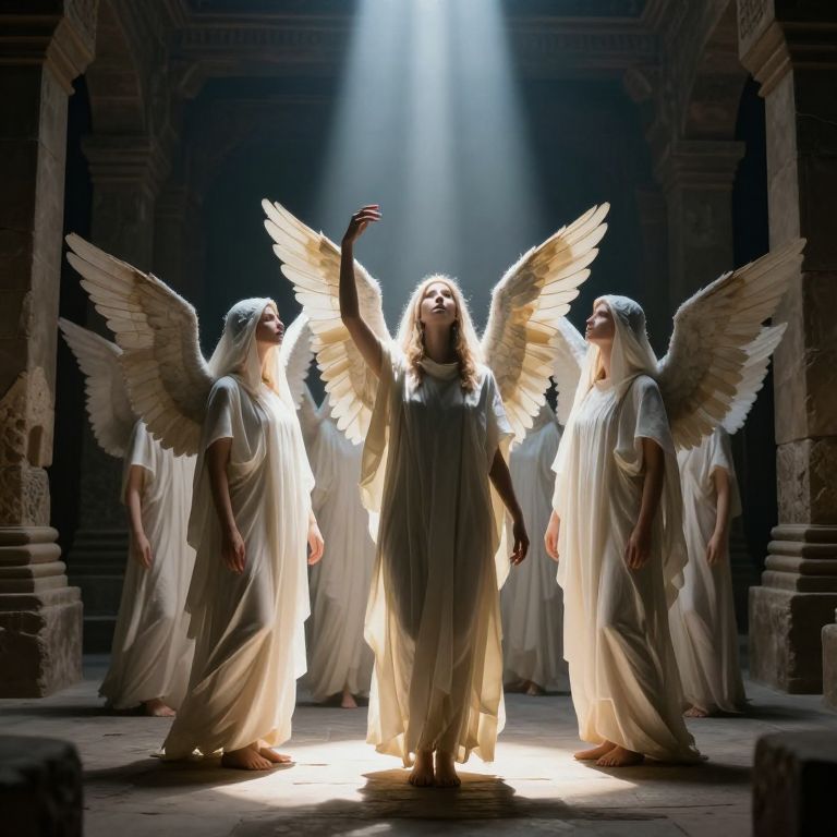 Photograph of four angelic figures in an ancient, dimly lit stone chamber. The central figure, with glowing white wings and flowing white robe, raises one arm in a gesture of blessing or command. Three other angels, similarly dressed in white robes and with white head coverings, stand on either side, slightly in shadow. A beam of bright light illuminates the central figure from above, creating a dramatic contrast with the dark background. The stone arches framing the scene add a classical, historical ambiance. The overall mood is mystical and ethereal.