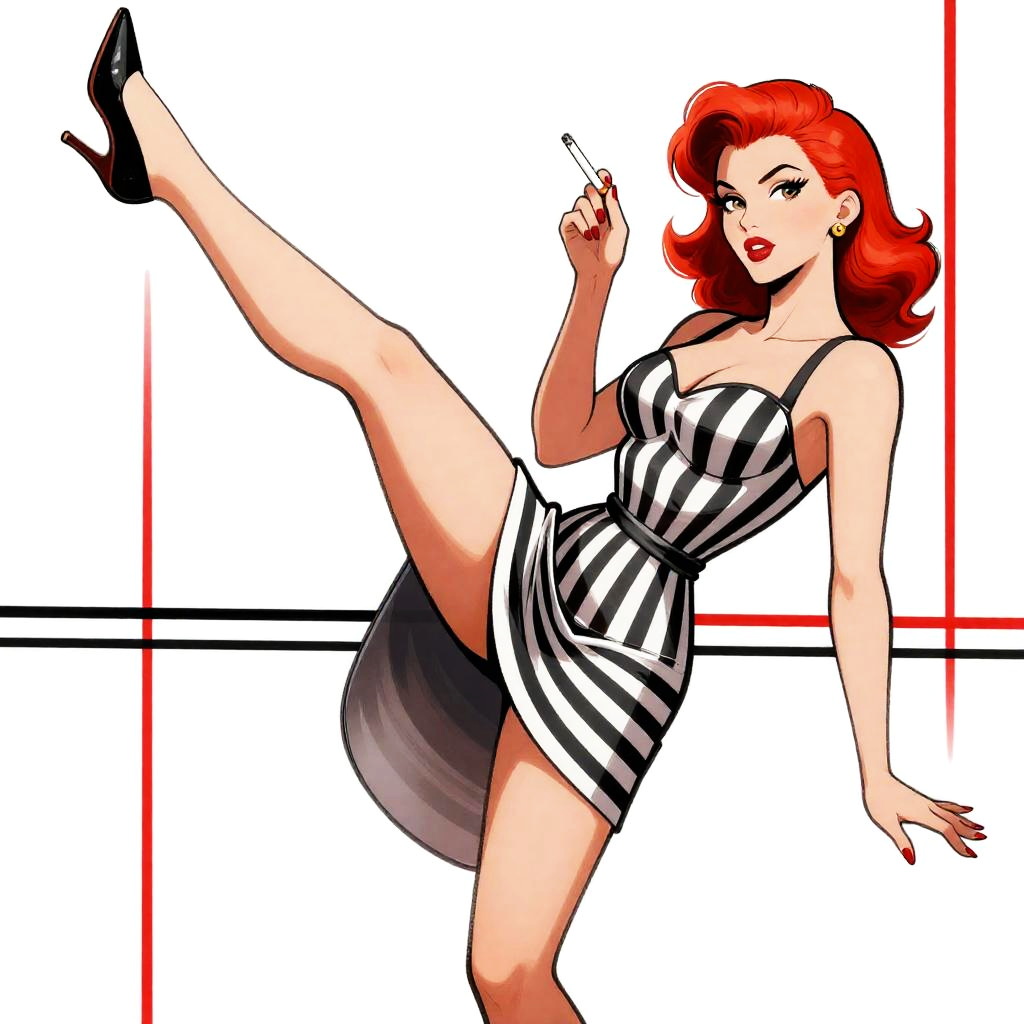 This digital drawing in a bold, comic-style features a strikingly beautiful woman with vibrant red hair, elegantly styled in a 1940s-inspired updo. She's wearing a black and white striped, form-fitting dress that showcases her slender figure. Her left leg is raised high in a dramatic pose, while she holds a cigarette in her right hand. The background is minimalistic with red and black geometric lines, emphasizing her dynamic movement and confident presence.