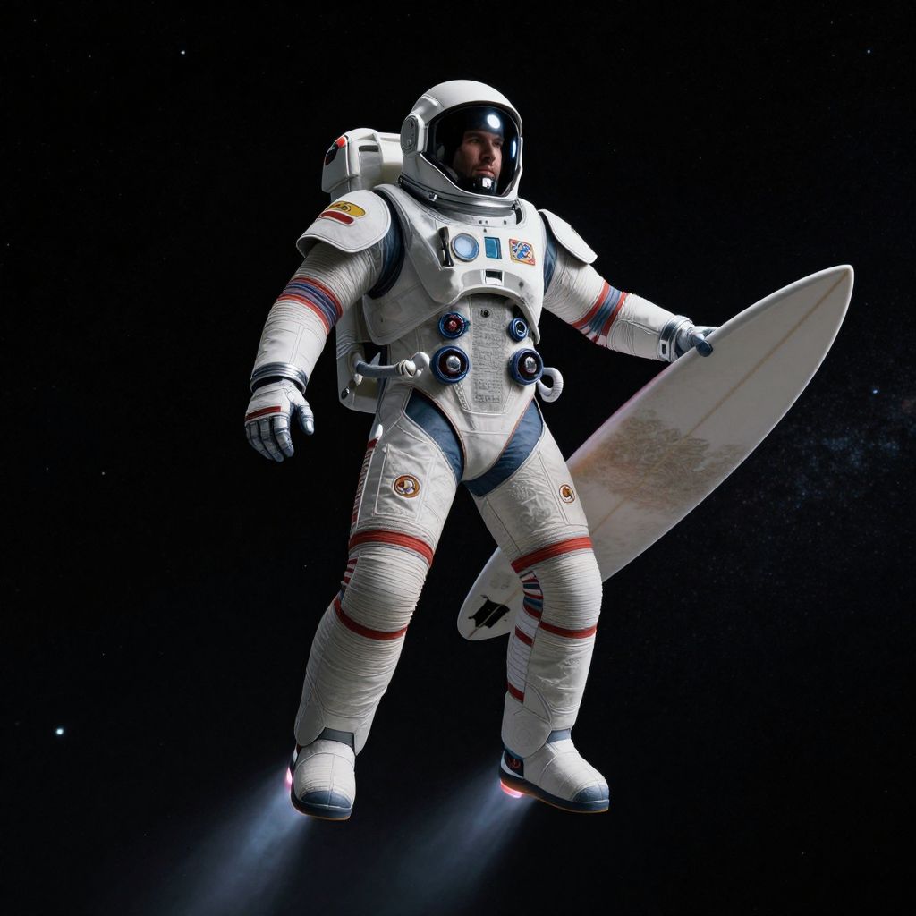 Photorealistic CGI of an astronaut in a white spacesuit with red stripes, helmet, and holding a surfboard, floating in dark space.