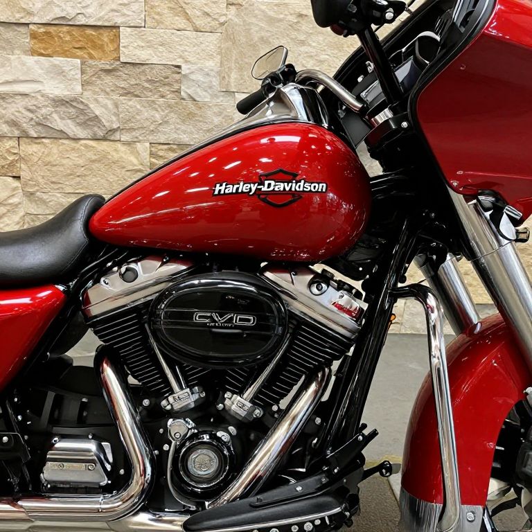 Close-up view of a gleaming 2021 Harley-Davidson CVO™ Limited motorcycle showcasing its polished chrome engine, vibrant red fuel tank emblazoned with the iconic \"Harley-Davidson\" logo, and sleek black-and-silver accents, displayed indoors against a textured stone wall backdrop.