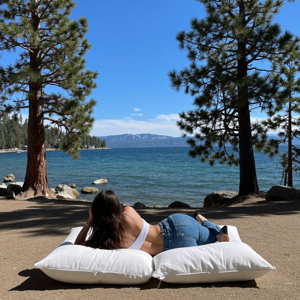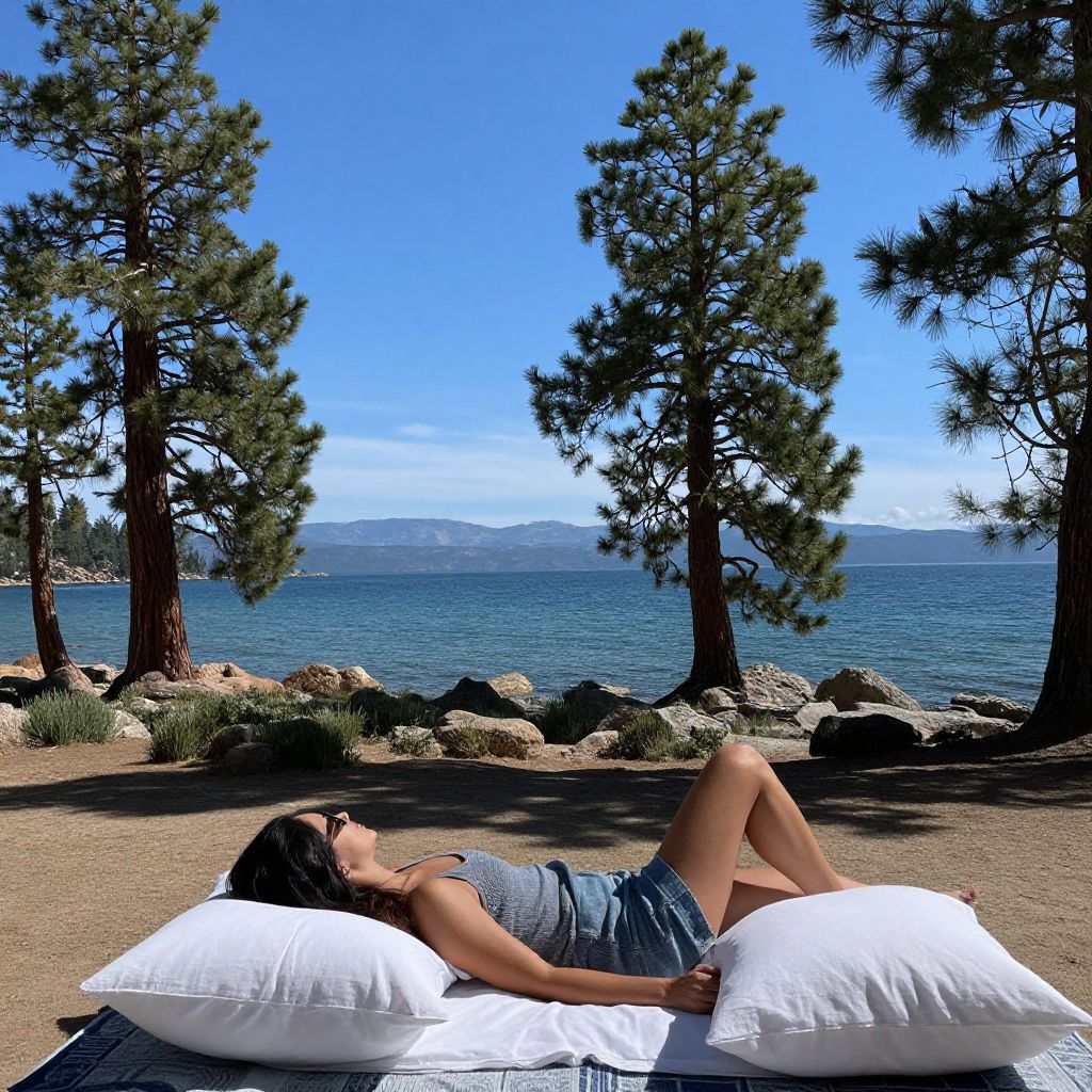 Woman lounging on white pillows by the serene shores of Lake Tahoe, framed by towering pine trees and distant mountains under a clear blue sky.
