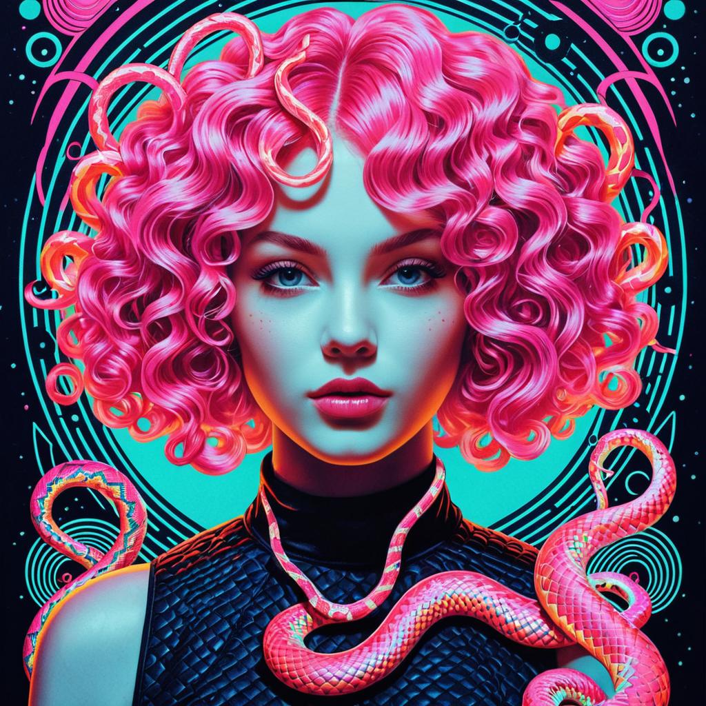 Psychedelic poster illustration of a woman with shoulder-length straight silver hair, glowing butterfly, neon geometric patterns, neon colors, high-quality, poster art, surreal, detailed hair, psychedelic, detailed cat, colorful, vibrant, surreal, professional lighting