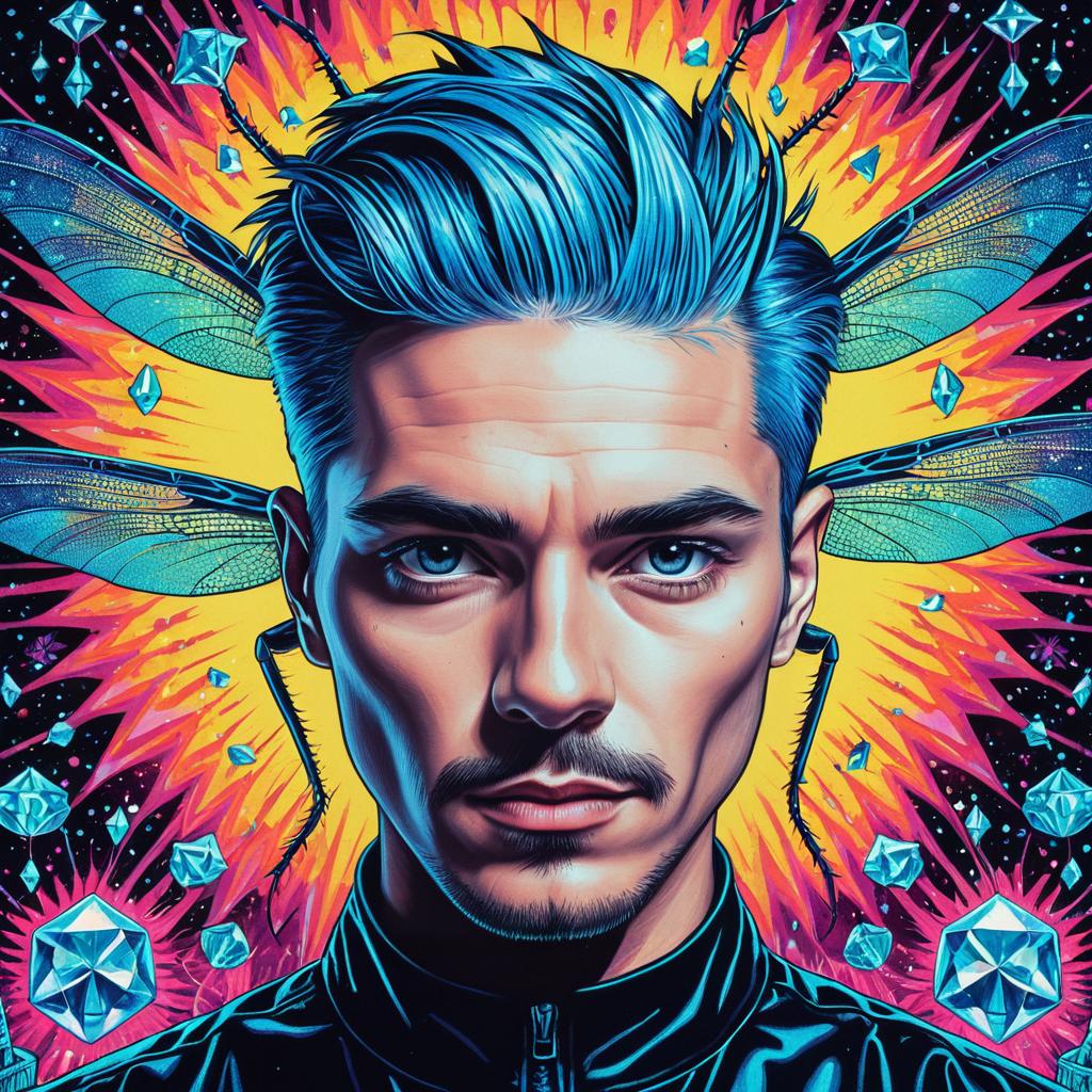 Surreal digital poster featuring a woman with shoulder-length straight silver hair illuminated in blue neon light. The background displays vibrant neon geometric patterns and glowing butterfly wings, creating a psychedelic and highly detailed artistic composition.