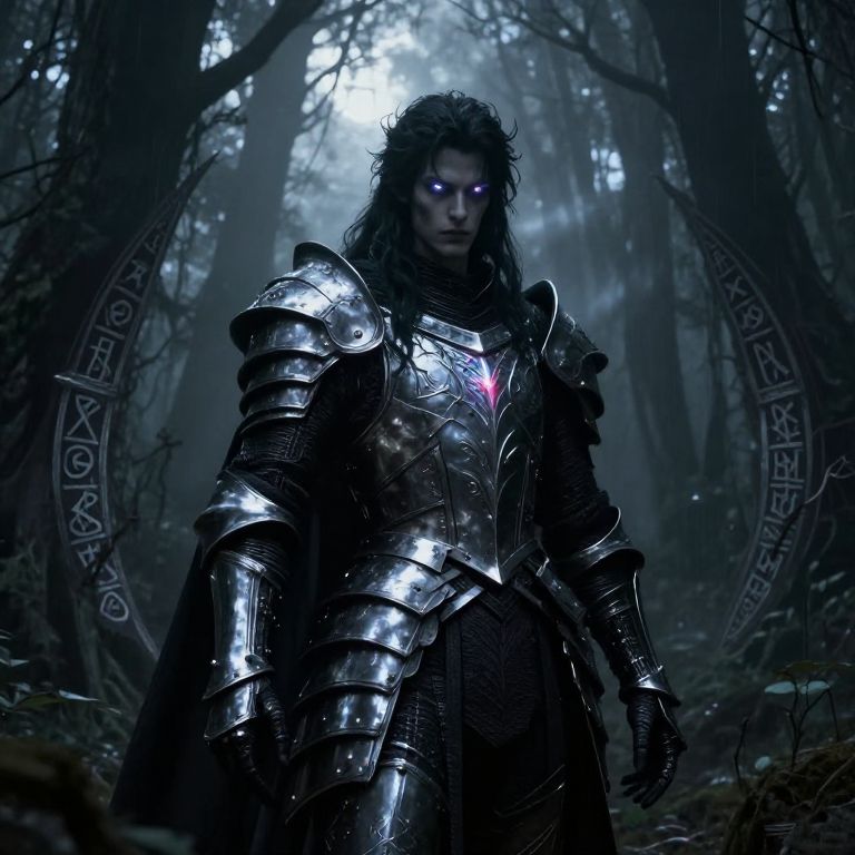 Lucilfer standing in a dark gothic forest, glowing eyes piercing the mist, intricate black and silver armor reflecting moonlight, surrounded by ethereal shadows and ancient runes, a powerful and mysterious aura, detailed fantasy art style.