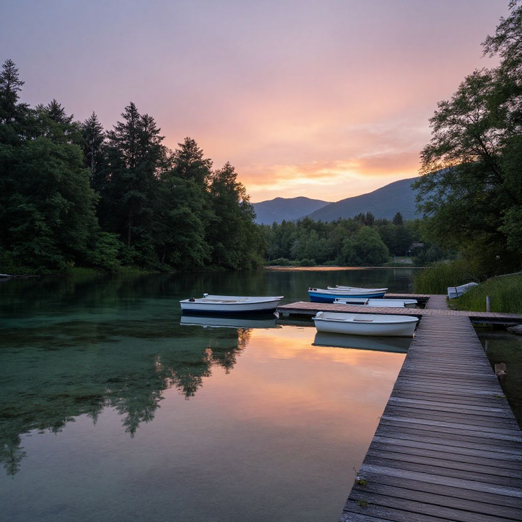 Photograph of a serene lakeside at sunset. Several small white rowboats are moored to a wooden dock on the right, which extends into the calm, reflective water. The sky transitions from pink to orange near the horizon, with dark, silhouetted trees lining both sides of the lake. In the background, mountain peaks are faintly visible. The water's surface mirrors the colorful sky and surrounding trees, creating a peaceful, symmetrical composition. The overall mood is tranquil and picturesque, highlighting nature's beauty at dusk.