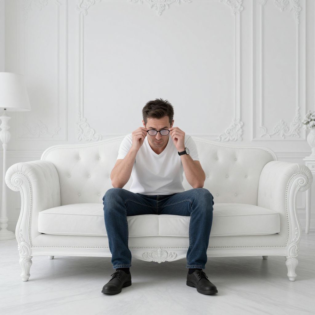 A man in his 40's sits on a luxurious white sofa, cleaning his glasses in a minimalist, hyper-detailed, white room with intricate details and a photorealistic appearance.