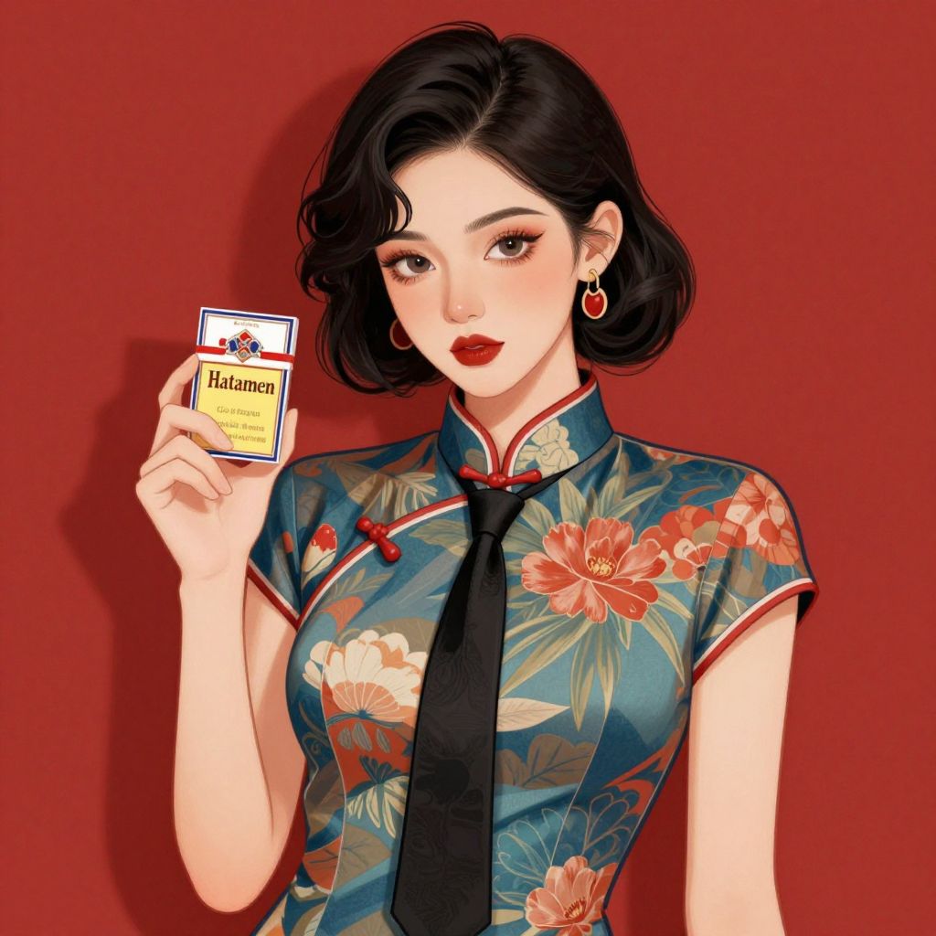 A vibrant digital illustration featuring a beautifully styled young woman in a traditional cheongsam adorned with floral patterns, complemented by a modern black necktie, holding a box of Hatamen cigarettes against a bold red background, showcasing a seamless blend of Chinese cultural aesthetics and Western fashion elements in a high-definition, retro-inspired visual style.