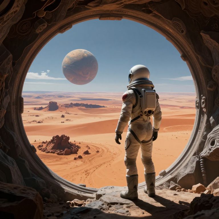 Photorealistic digital artwork: Astronaut in white spacesuit stands in circular spaceship window, gazing at distant orange desert planet and moon under bright blue