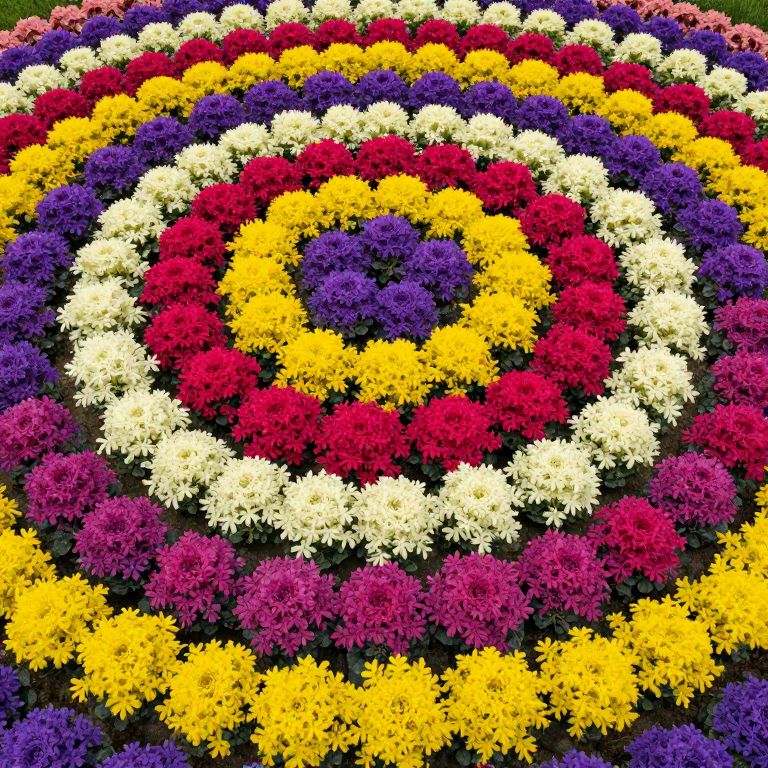 Vibrant photograph of a circular flower bed with concentric rings of red, yellow, purple, and white chrysanthemums.