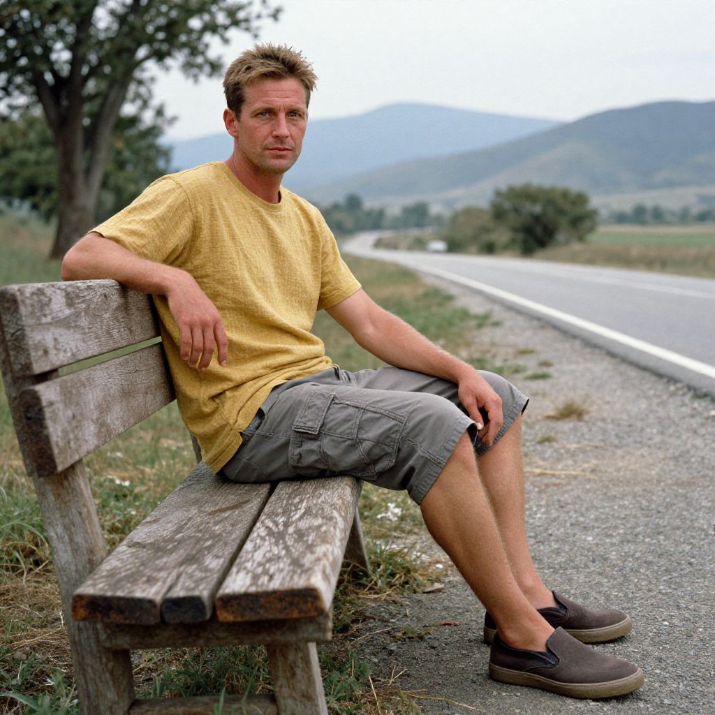 A man, breathable hemp t-shirt, muted mustard yellow, cargo shorts, slate gray, rugged slip-on shoes, dark brown, rural highway pull-off, weathered wooden bench, distant mountains, chromogenic film, relaxed expression, enjoying the moment. Man has masculine face and piercing eyes