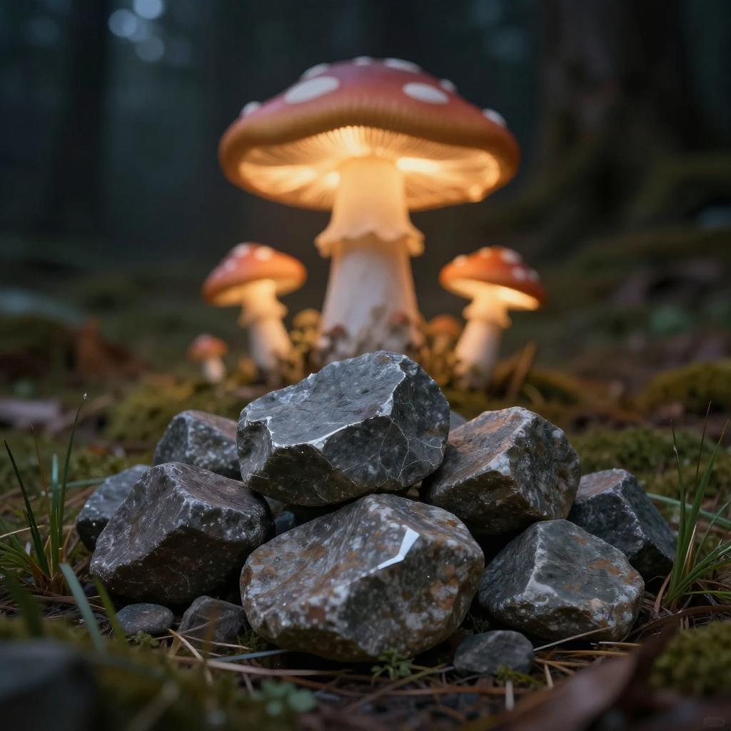 Stones, sharp stones, ((big fantasy mushroom)), (((glow))), night, dark theme, cinematic, (long grass), macro photography, (sharp shot), mj