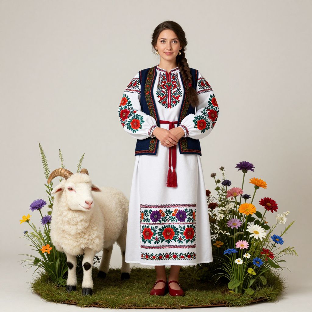 Photograph of a young woman with braided brown hair, wearing a traditional white embroidered dress and black vest, standing beside a white sheep, surrounded by