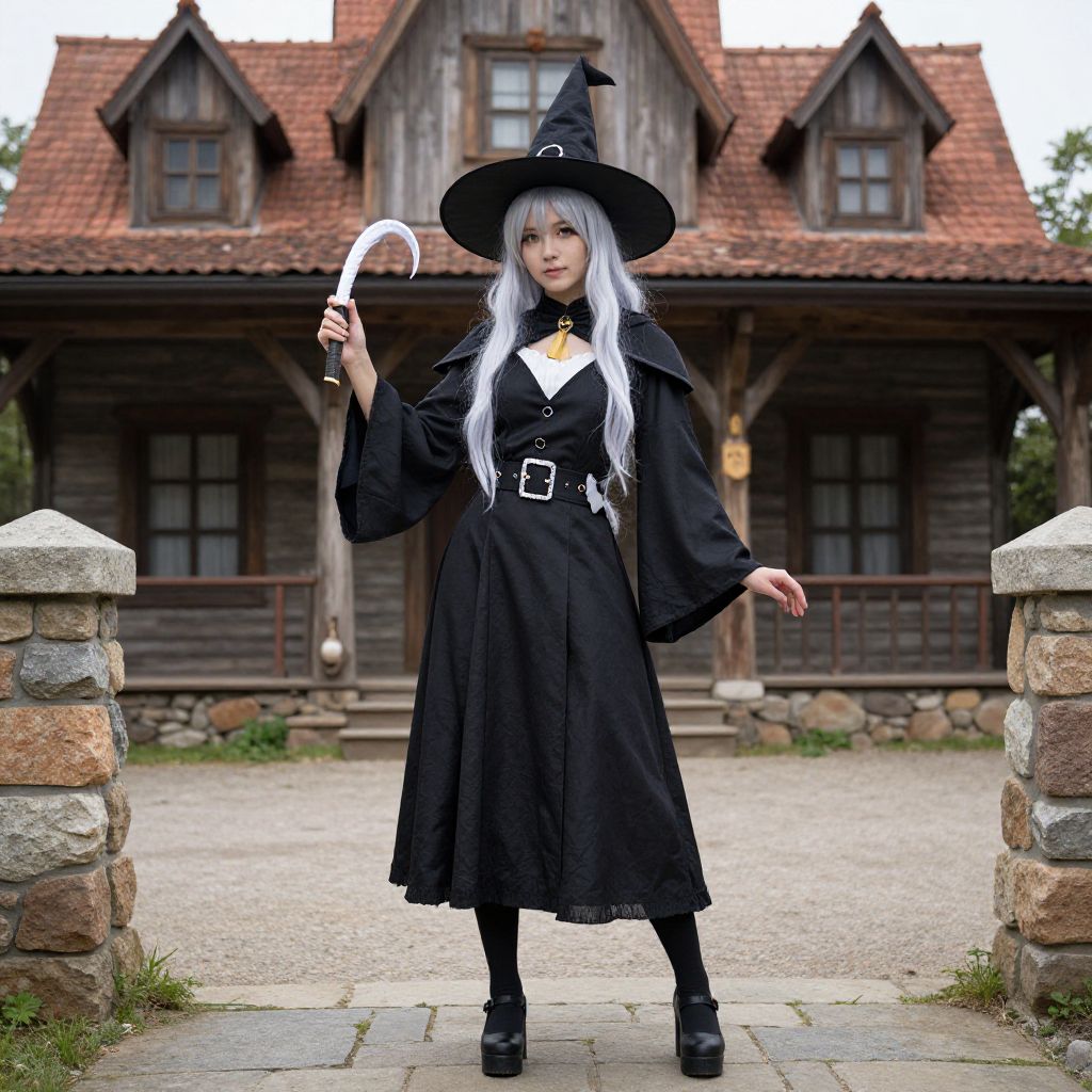 "Witchs House Cosplay, woman in a witch costume standing in a courtyard"