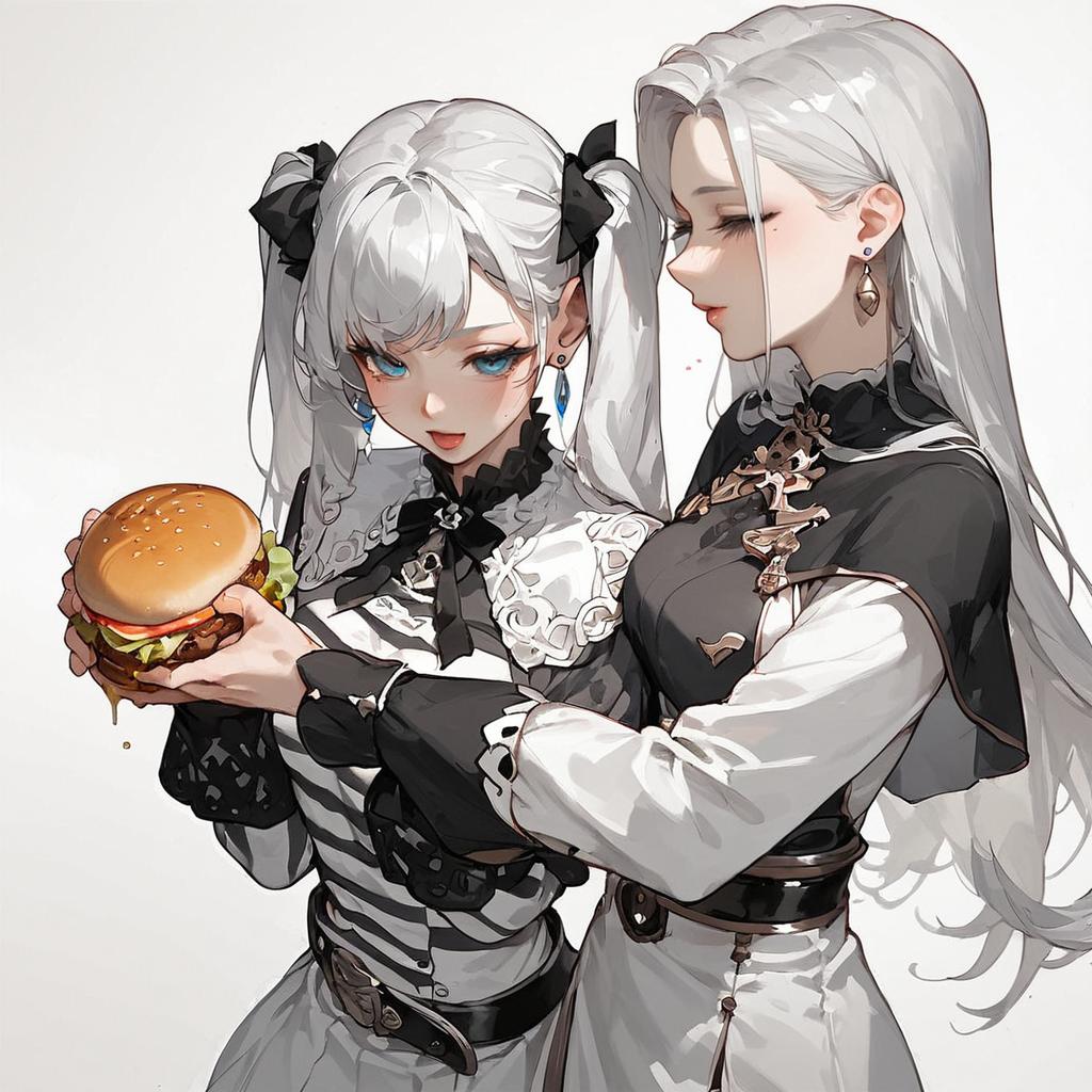 Score_9, score_8_up, source_anime, 1girl, hair ornament, red headband, red glasses, sleeveless shirt, white coat, black skirt, red leggings, gloves, (large breasts:0.8), sitting, table, chair, (eating a huge hamburger:1.25), happy
