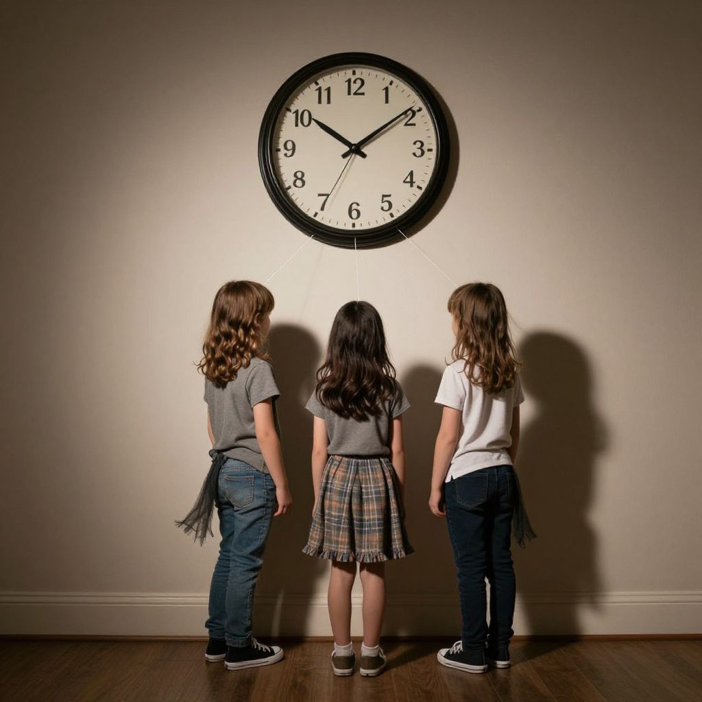 Photograph of three young girls with long hair, facing a wall clock, standing in a dimly lit room, wearing casual clothes. Shadows cast on