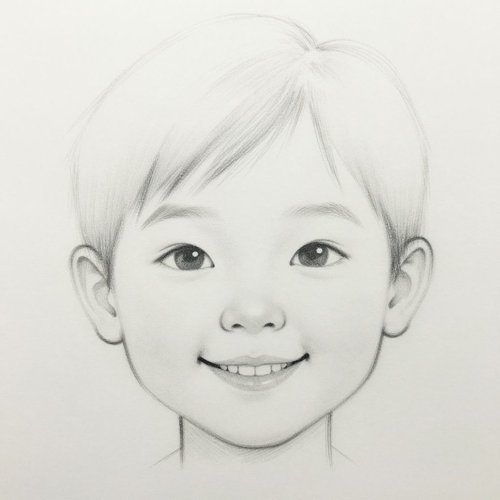 This is a detailed black-and-white pencil drawing of a young child with a cheerful expression. The child has short, slightly messy hair and large, expressive eyes with small, dark pupils. They are smiling gently, revealing a small, neat set of teeth. The child's ears are positioned symmetrically on either side of their head. The background is completely white, making the child the sole focus of the image. The pencil lines are delicate yet precise, capturing the softness of the child's features and the subtle texture of their hair. The overall style is realistic and tender.