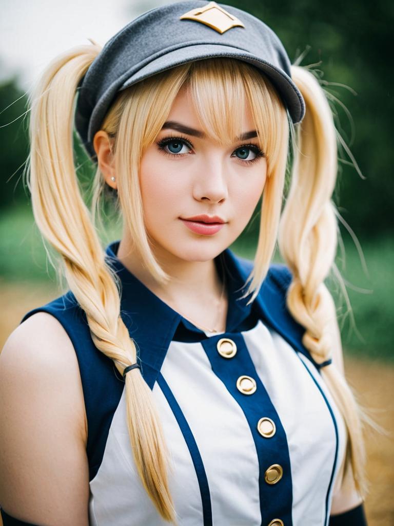 Photo-realistic cosplay photo of person in artoria caster (first ascension) (fate) costume. 1girl, green eyes, hair between eyes, blonde hair, long hair, twintails, ahoge, small breasts, grey gloves, hat, grey headwear, sleeveless dress, white dress, bare shoulderslifestyle stock photo, shallow depth of field, lifestyle stock photography, shallow depth of field, natural lighting, warm tones, soft background blur, candid moments, vibrant colors, realistic textures, modern casual clothing. full body shot