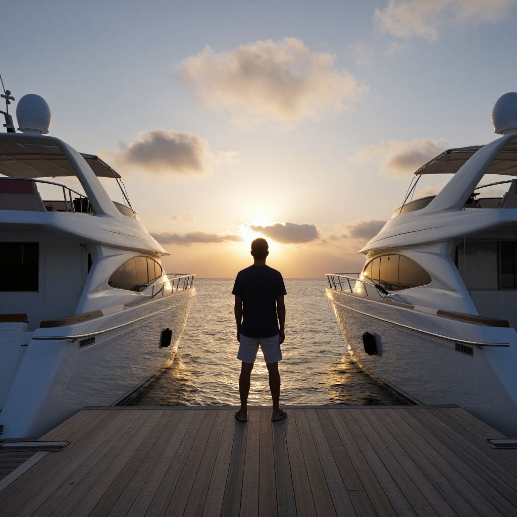 Photograph of a silhouetted man standing on a wooden dock between two large white yachts at sunset. The man, wearing a short-sleeved shirt and shorts, faces the glowing orange and yellow horizon, with the sun partially obscured by clouds. The calm water reflects the sunset, and the yachts' sleek, modern designs are symmetrically positioned on either side. The sky is a gradient of blue to orange. The image conveys a sense of tranquility and anticipation, with the man's silhouette adding a dramatic contrast against the vibrant background.