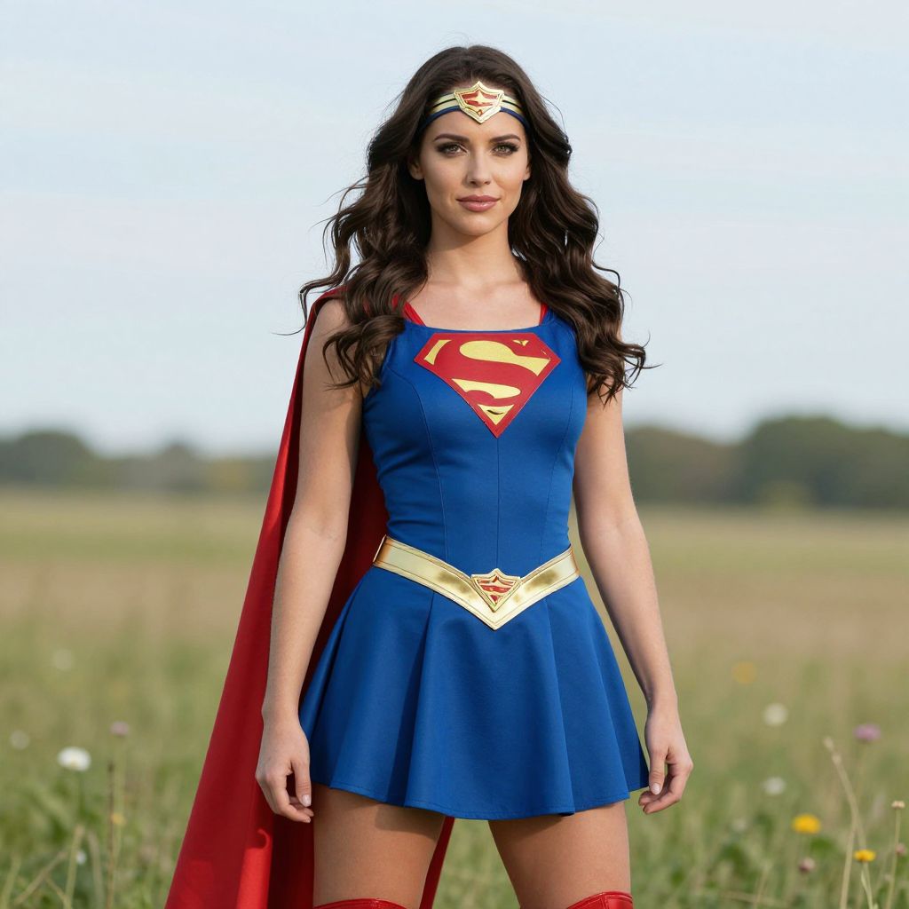 Super Woman Dress Costume, a woman dressed as superman standing in a field