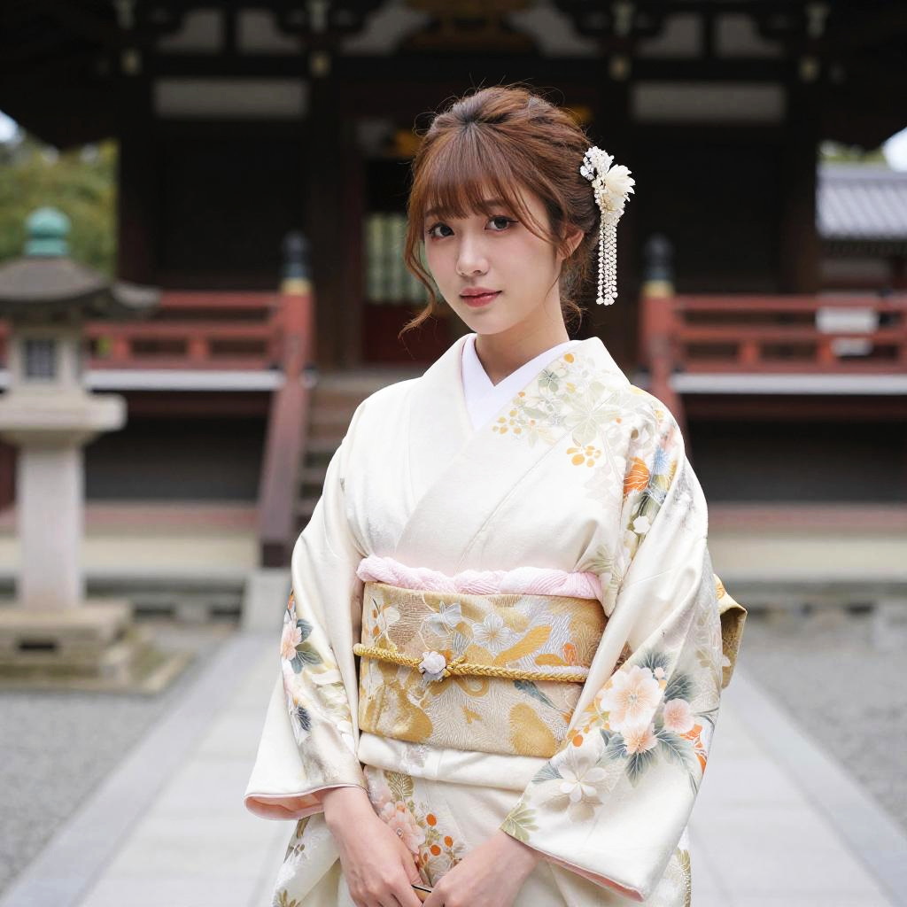 Asian with light brown hair in traditional silk kimono, delicate floral patterns, intricate hair accessories, standing in a historic temple courtyard, elegant and detailed