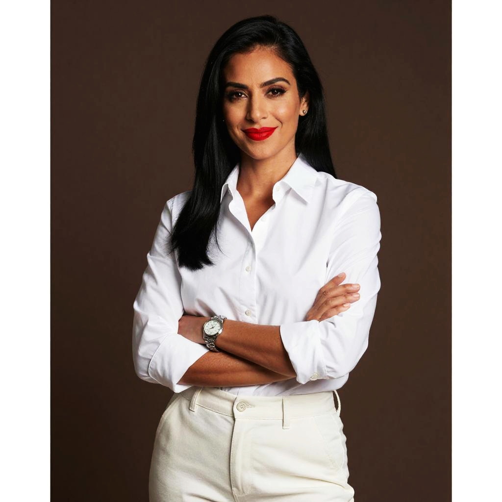 Photograph of a confident woman with long, straight black hair and light brown skin, standing against a dark brown background. She's wearing a crisp white button-up shirt with the sleeves rolled to her elbows, and white pants. She has red lipstick, subtle eye makeup, and is smiling softly. Her arms are crossed, and she's wearing a silver watch on her left wrist.
