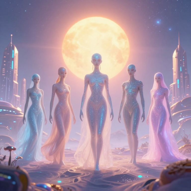 CGI image of five futuristic, glowing, silver-skinned women in shimmering, form-fitting dresses walking towards a radiant, sun-like orb in