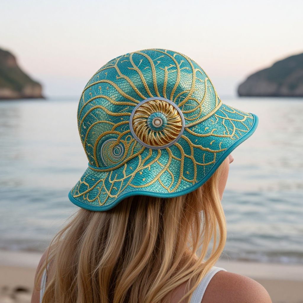 Mermaid-inspired nautilus hat worn by a woman with long blonde hair, featuring intricate teal and gold spiral patterns, set against a serene beach backdrop with calm waters and distant cliffs.