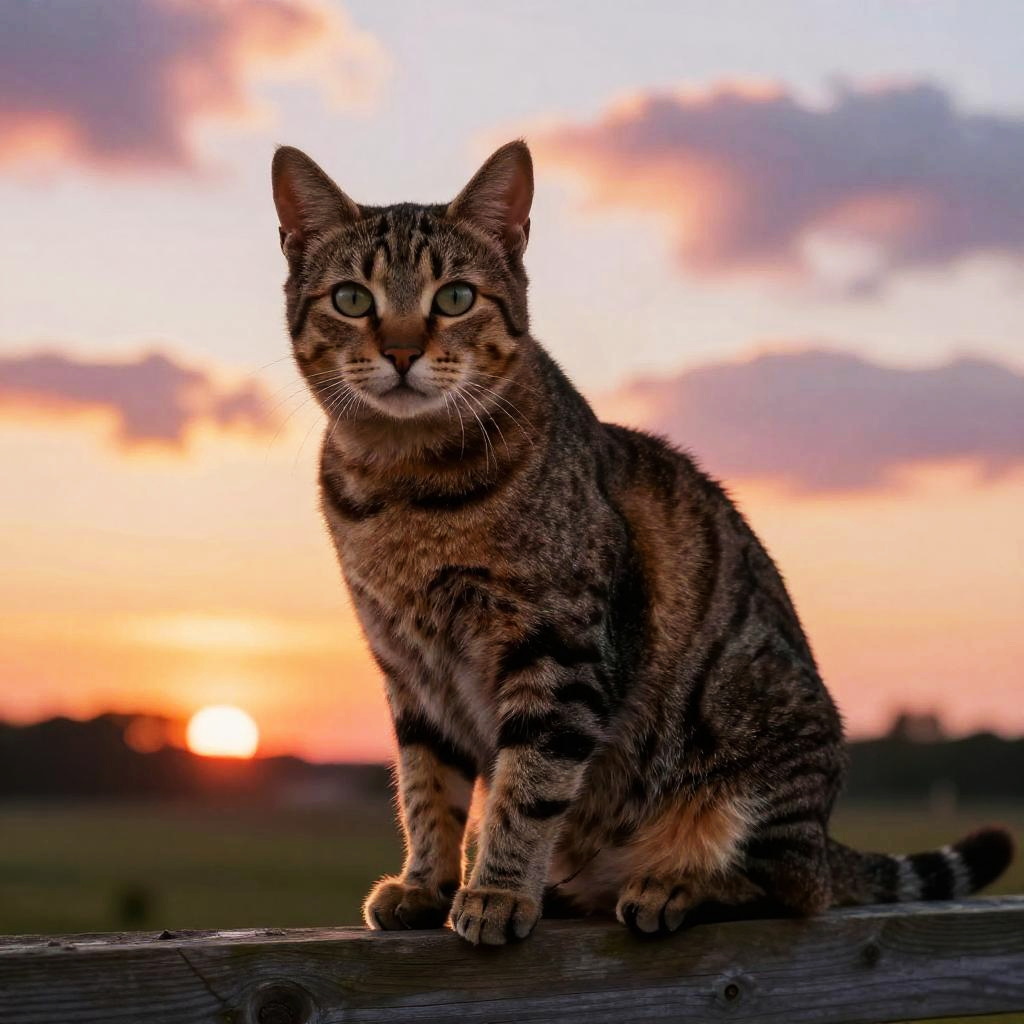 Tawny tabby cat perched elegantly on a wooden fence at sunset, vibrant sky with pink and orange clouds, sharp eyes and expressive whiskers, peaceful countryside