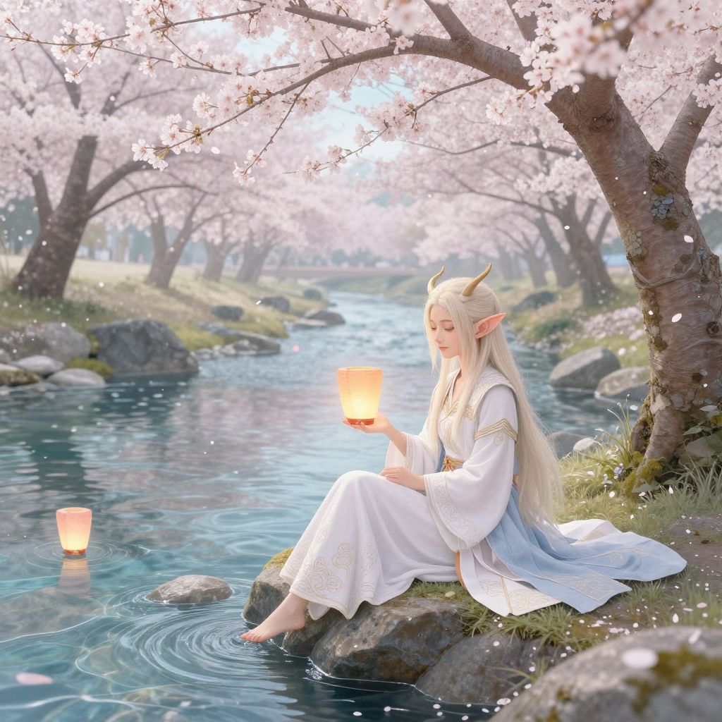 Talen serene nature scene featuring an elegant elf named Talen sitting beside a crystal-clear river, surrounded by blossoming cherry trees and floating lanterns, soft pastel color palette with intricate details on clothing and petals, peaceful and magical ambiance.