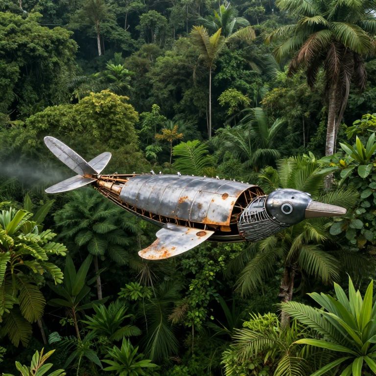 A clockwork whale glides silently through the Amazon rainforest canopy, its metal fins rustling leaves in a synchronized echo of time and nature.