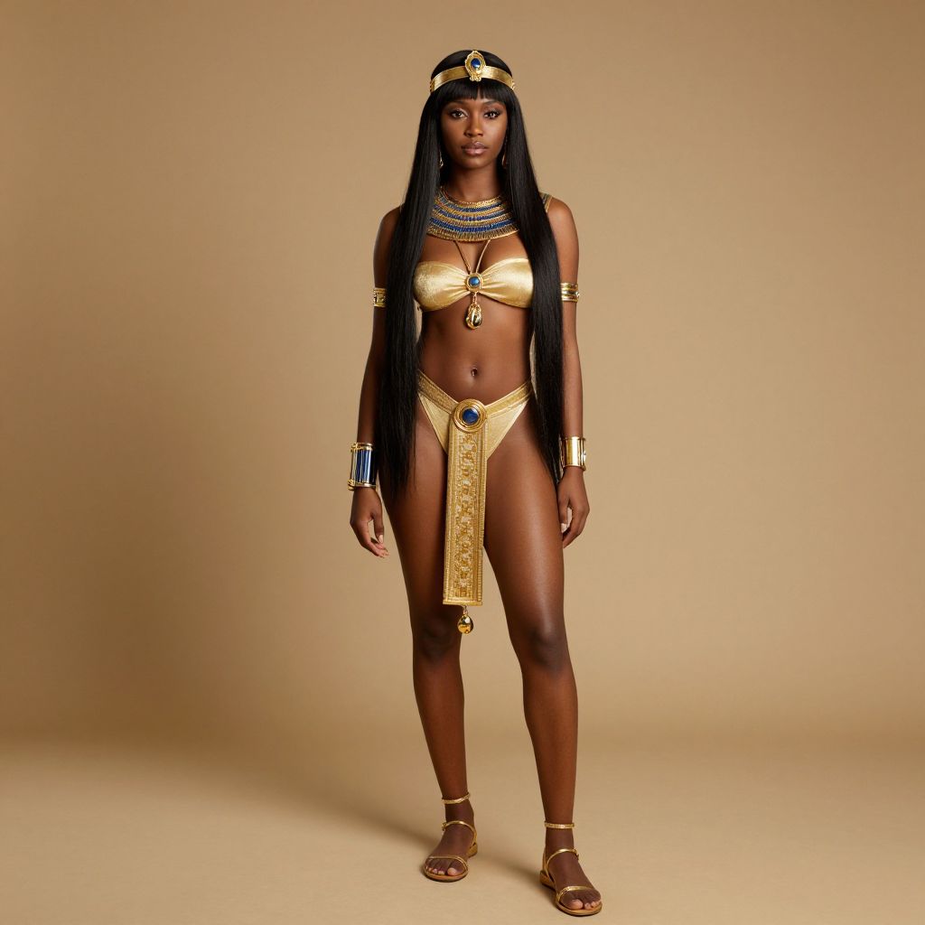 Photograph of a tall, dark-skinned African woman standing against a beige background. She has long, straight black hair, adorned with a gold headpiece featuring a central jewel. She wears a gold bikini-style top with a small pendant in the center, and a matching gold thong with an ornate, jewel-embellished front panel. Her accessories include layered gold necklaces, gold armbands, and strappy gold sandals. Her expression is neutral, and she stands confidently with her arms relaxed by her sides. The overall look is regal and elegant, with a focus on golden, ancient Egyptian-inspired attire.