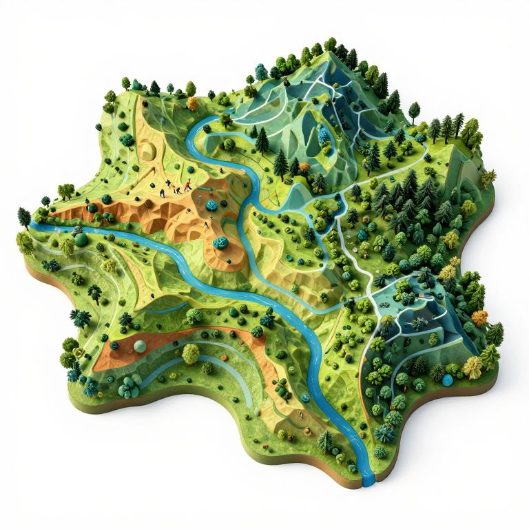 3D topographic map illustration: vividly colored terrain with green forests, blue winding river, orange hills, and white roads, viewed from above.