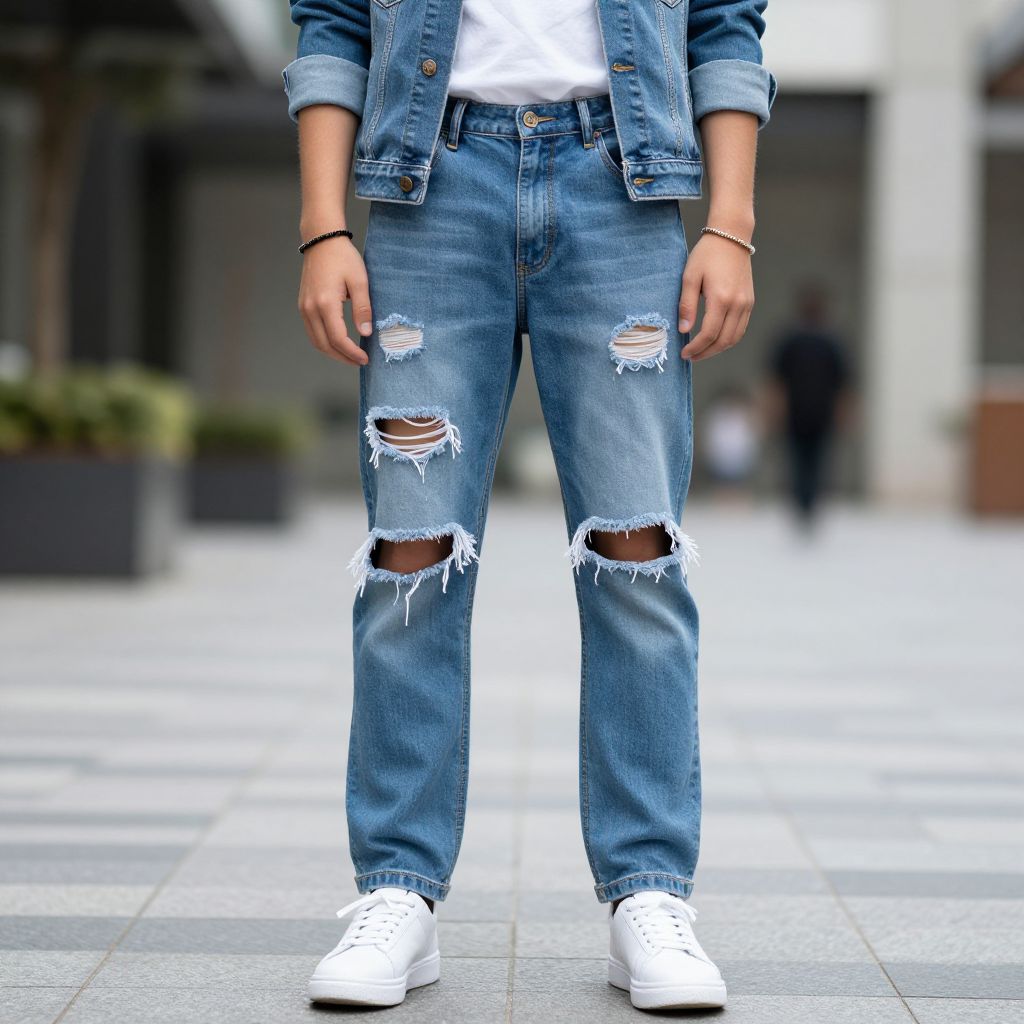 Damage jeans costume, 1boy, denim, male focus, solo, jeans, pants, torn pants, torn clothes, torn jeans, brown hair, shirt, standing, shoes, bracelet, denim jacket, outdoors, full body, blurry background, blurry, jewelry, pocket, looking at viewer, realistic, blue pants, closed mouth