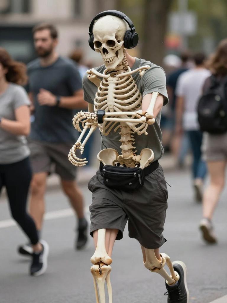 Hyper-realistic full-body photograph of a human skeleton jogging with headphones on, checking a smartwatch in a busy urban park, wearing a casual t-shirt and shorts with a fanny pack, candid street photography style, shallow depth of field, natural motion blur, realistic lighting, high resolution, ultra-detailed, looks like a real camera photo, not an illustration or 3d render