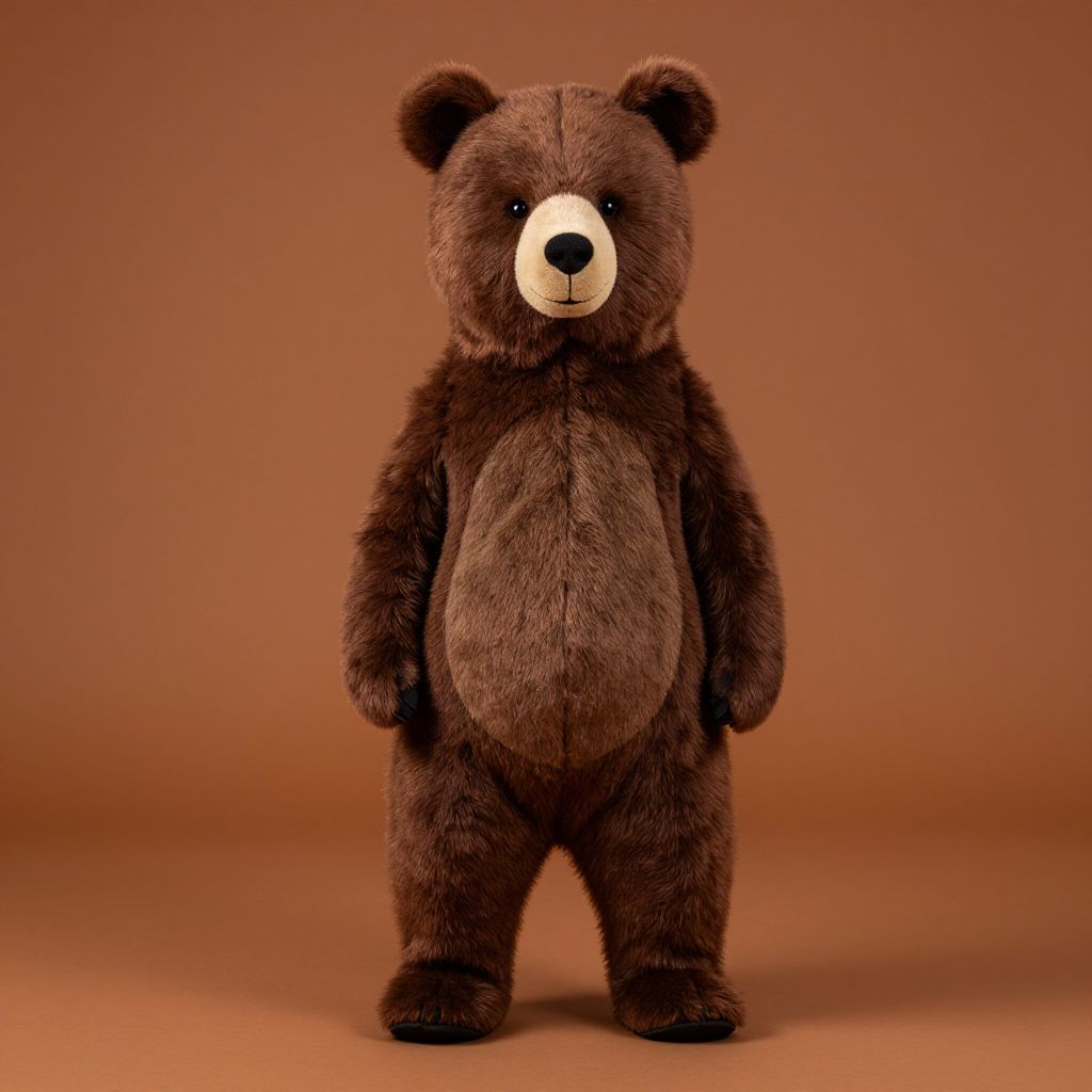 Photograph of a brown, plush teddy bear standing upright against a solid, warm brown backdrop. The teddy bear has a soft, fuzzy texture, with a slightly lighter brown patch on its chest and a cream-colored circular nose and small, black, round eyes. Its ears are round and positioned symmetrically on top of its head. The bear's arms are slightly outwards, and its legs are straight, giving it a balanced, front-facing stance. The overall lighting is even, highlighting the teddy bear's plush texture and warm color palette.