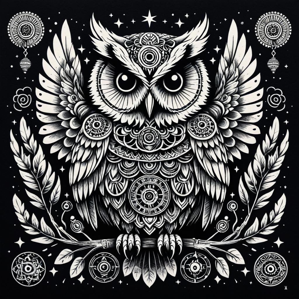 Hand-drawn whimsical illustration of an owl perched on a branch holding a glowing lantern. The artwork features dynamic and expressive linework with varied thickness, soft watercolor washes over detailed ink outlines, textured brushstrokes, and fine cross-hatching and stippling techniques. The owl has bright, piercing eyes, detailed feathers, and a luminous lantern casting warm light, all isolated on a white background.