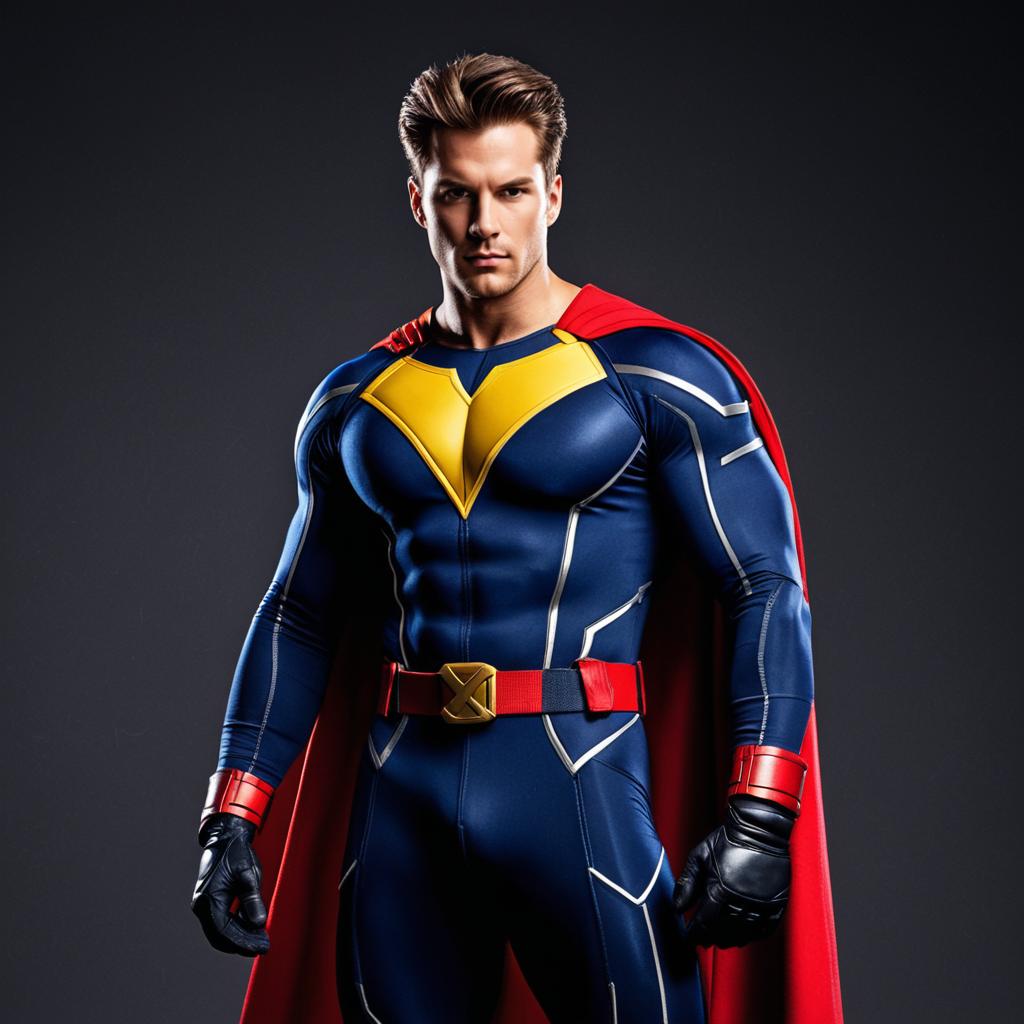 Xmen outfit, photograph of a muscular white man, medium build, brown hair, styled upwards, serious expression, wearing a superhero costume, navy blue and yellow bodysuit with red accents, red gloves, red belt with silver buckle, red cape, standing against a grey metallic background, realistic lighting, detailed ures, comic book style, daytime, studio setting, full body, centered, slightly angled, high contrast