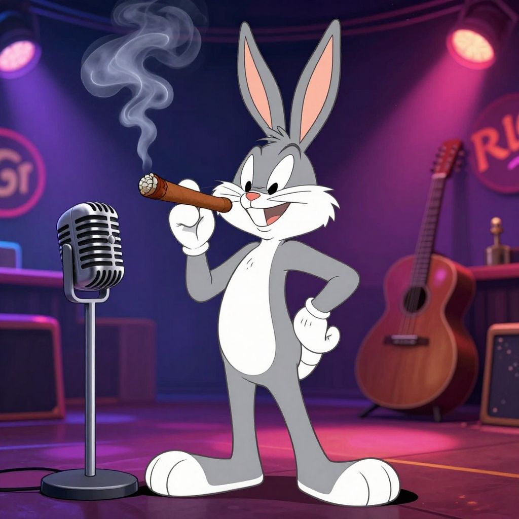 Bugs Bunny smoking a cigar with a sly grin, standing in a smoky jazz club, neon lights, vintage microphone, dynamic pose, animated highly expressive character design