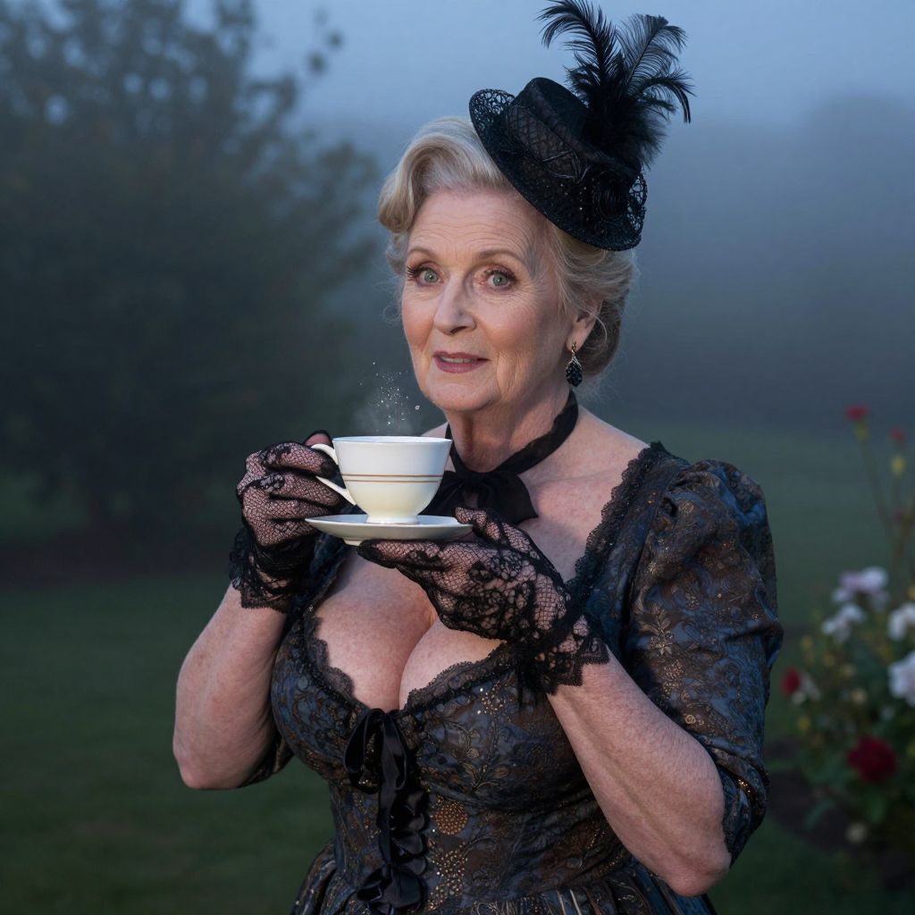 An elderly woman with a short, styled hairstyle, dressed in a Victorian-era costume with lace gloves and a small feather hat, standing in a foggy garden at twilight, her face gentle and thoughtful, holding a teacup with a subtle sparkle of light in her eyes. The woman has big tits and cute face