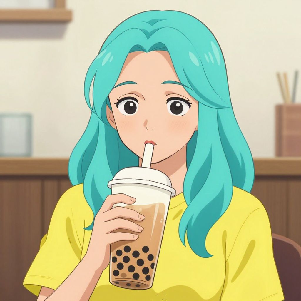 Introspective cute malay girl wearing yellow and turquoise drinking boba tea korean comic style ira sluyterman,