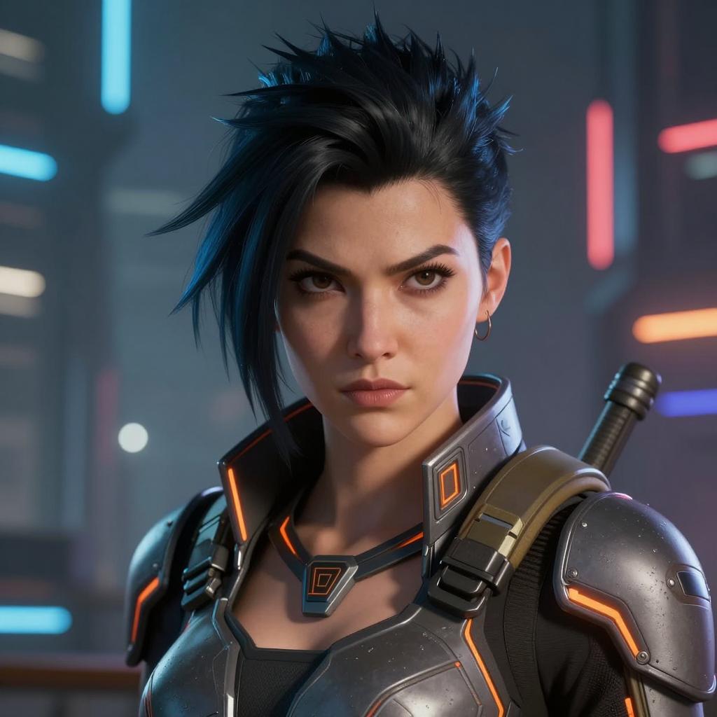 Close-up portrait of a female character from a futuristic setting, featuring spiked short black hair with blue highlights. She wears advanced tactical armor with glowing orange accents, set against a blurred cyberpunk cityscape with neon lights. The cinematic lighting highlights the detailed texture of her skin and armor, emphasizing a fierce and determined expression.