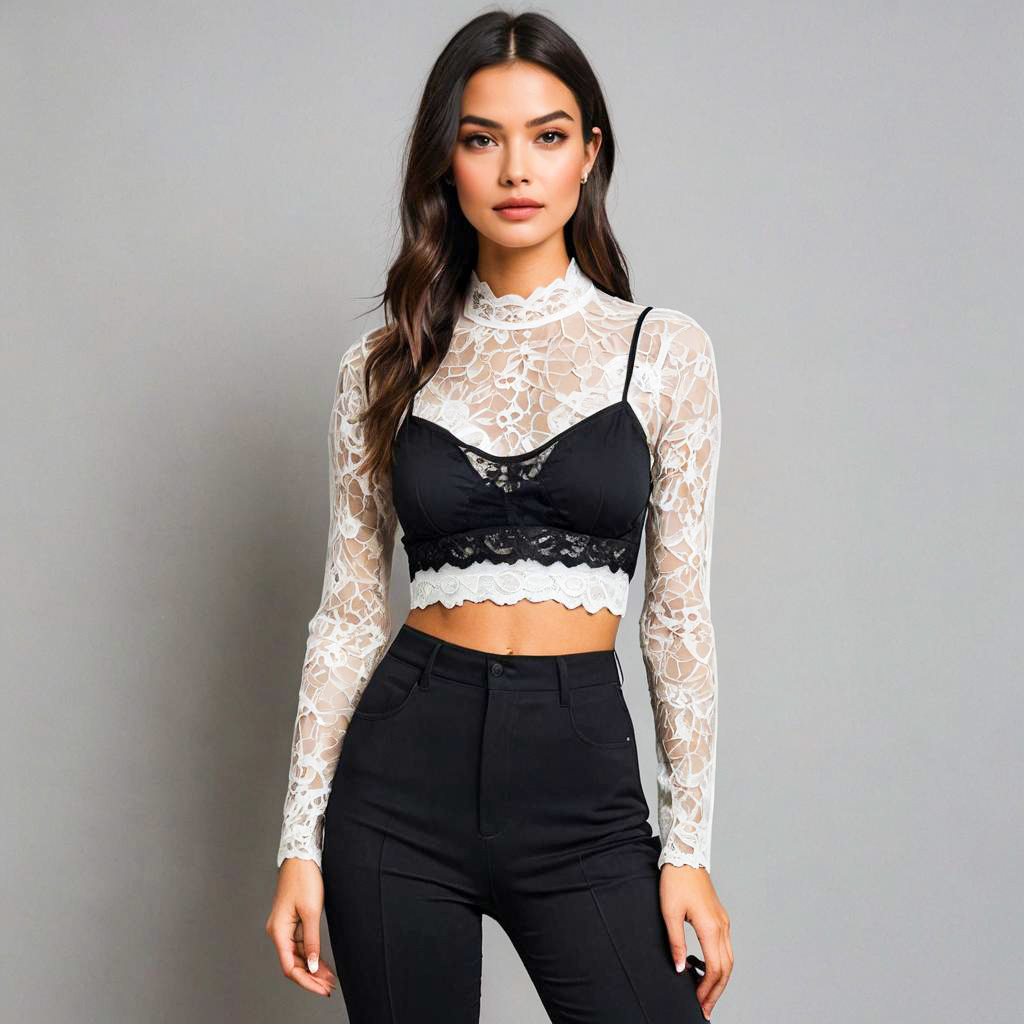 Young adult woman, Form-Fitting, Long Straight style, under outfit bra, black lace bralette with sheer mesh top and high-waisted white trousers, edgy style