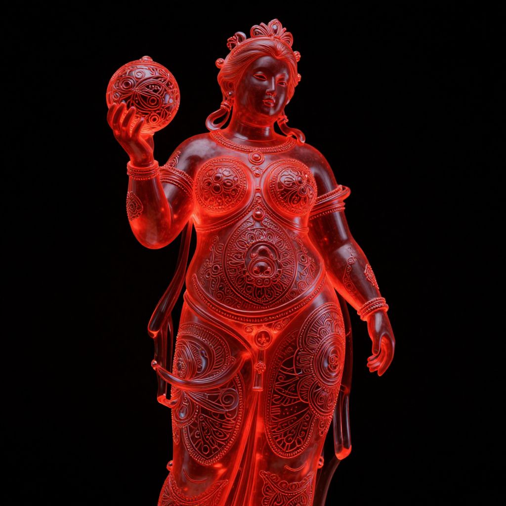 Digital CGI image of a glowing red, ornately designed, curvaceous female statue holding a spherical object, against a black background.