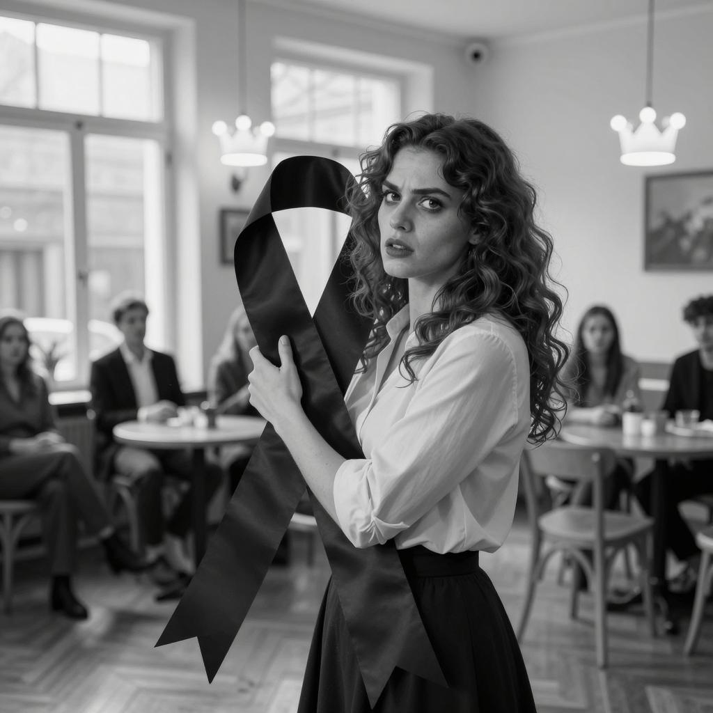 Black and white photograph of a woman with wavy, voluminous hair wearing a light shirt and dark skirt. She has an intense expression and is embracing a large, dark, ribbon-like object. Several people sit in the background. Large windows with light filtering through. Wooden floor, tables, and chairs. Crown-shaped lights on the wall.