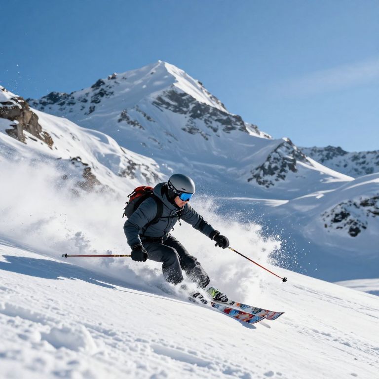 Against the backdrop of eternal snow-capped peaks, a skier carves through pristine powder, embodying the paradox of surrendering to gravity while chasing the ephemeral thrill of freedom.
