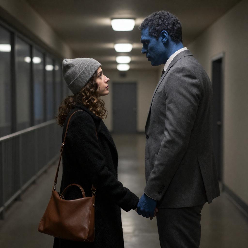 Photograph of a dimly lit indoor hallway. A woman with curly brown hair, wearing a gray beanie, black coat, and brown shoulder bag, holds hands with a blue-skinned man in a gray suit. Both face each other, intense expressions. Background includes glass windows, metal barriers, and overhead lights.