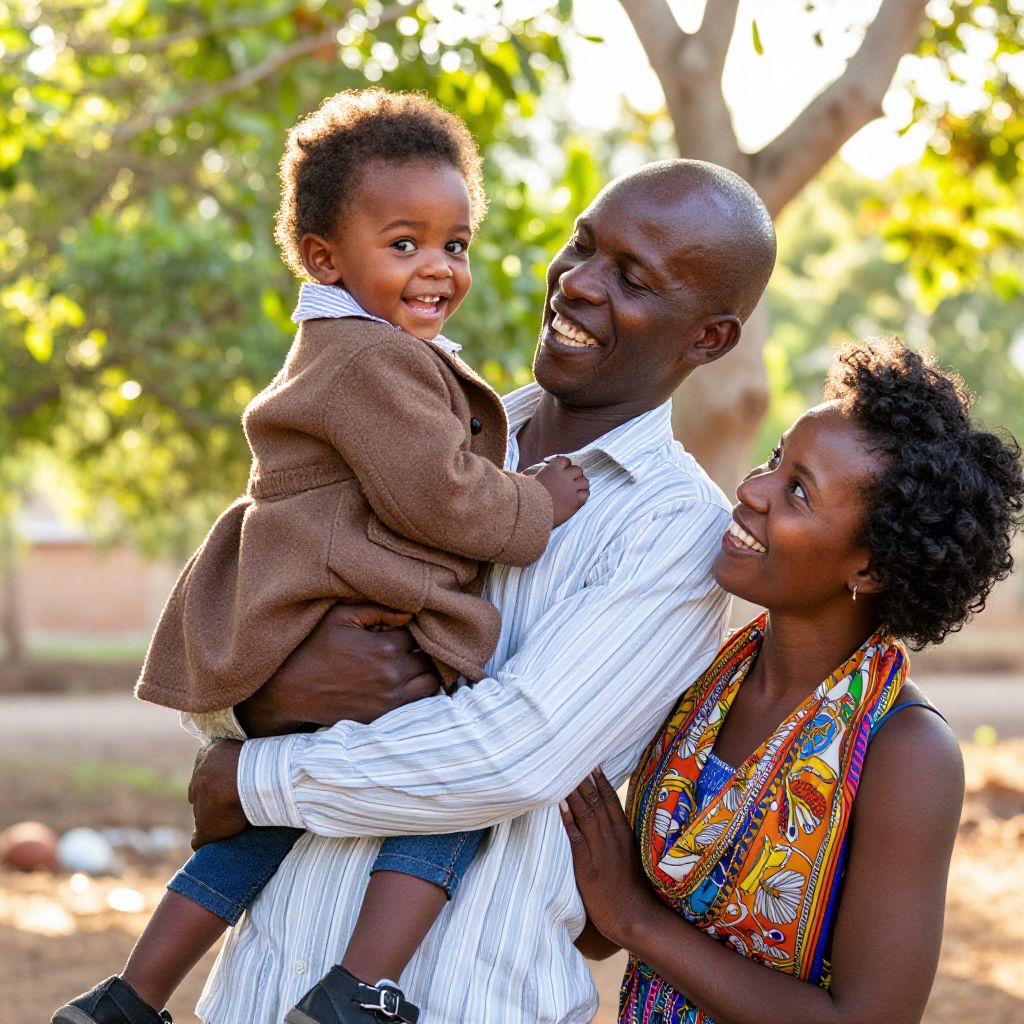 A vibrant photograph of a happy African family outdoors. A beaming dark-skinned man with a shaved head and striped shirt carries a laughing toddler with curly hair in a brown coat. The woman beside them, with curly hair and a colorful scarf, smiles warmly. Sunlight filters through the trees in the background, casting a warm glow over the lush greenery.