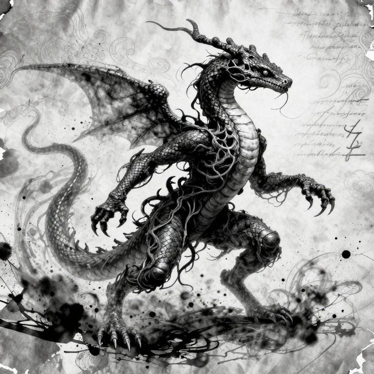 A hauntingly detailed black-and-white illustration depicts a mythical creature with serpentine features and roots entwined in its body, rearing against a parchment-like background adorned with splattered ink and swirling patterns, evoking the dynamic energy of an ancient, evolving language caught in a tempestuous ink storm.