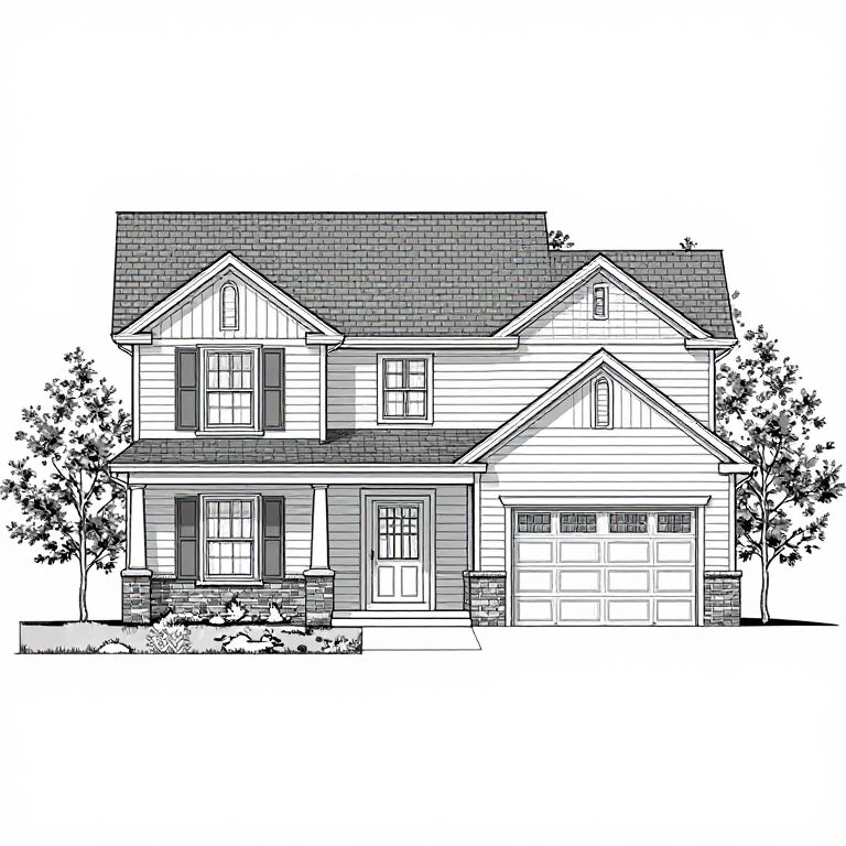 Black-and-white architectural drawing of a two-story suburban house with a gabled roof, double garage, front porch, and two small trees.